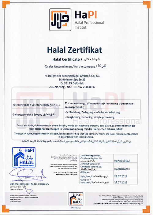 Bei uns steht Qualität an erster Stelle. Unsere Produkte unterliegen strengen Hygiene- und Qualitätsstandards. Wir sind sowohl QS-Zertifiziert, als auch Halal-Zertifiziert – für ein Höchstmaß an Sicherheit und Vertrauen. Unser Hähnchenfleisch stammt ausschließlich aus Deutschland.